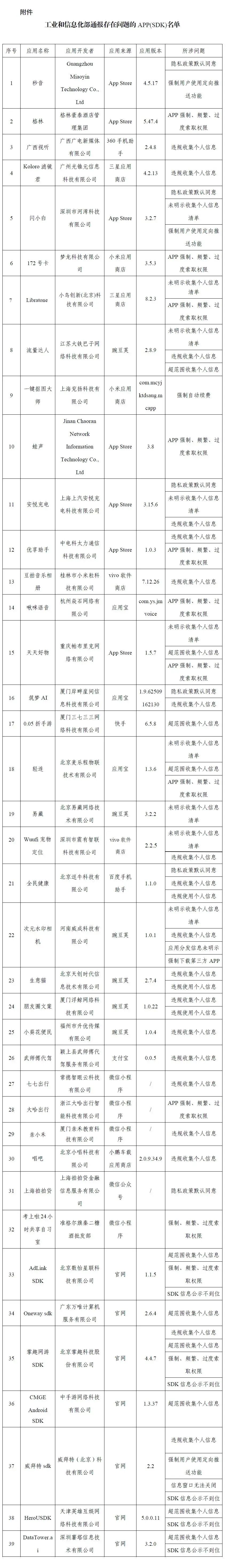 附件:工业和信息化部通报存在问题的APP(SDK)名单