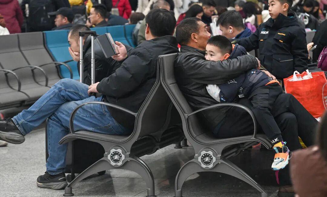2月2日,重庆北站春运首日,候车厅内的小朋友依偎在家人肩头。汪彦彤 摄