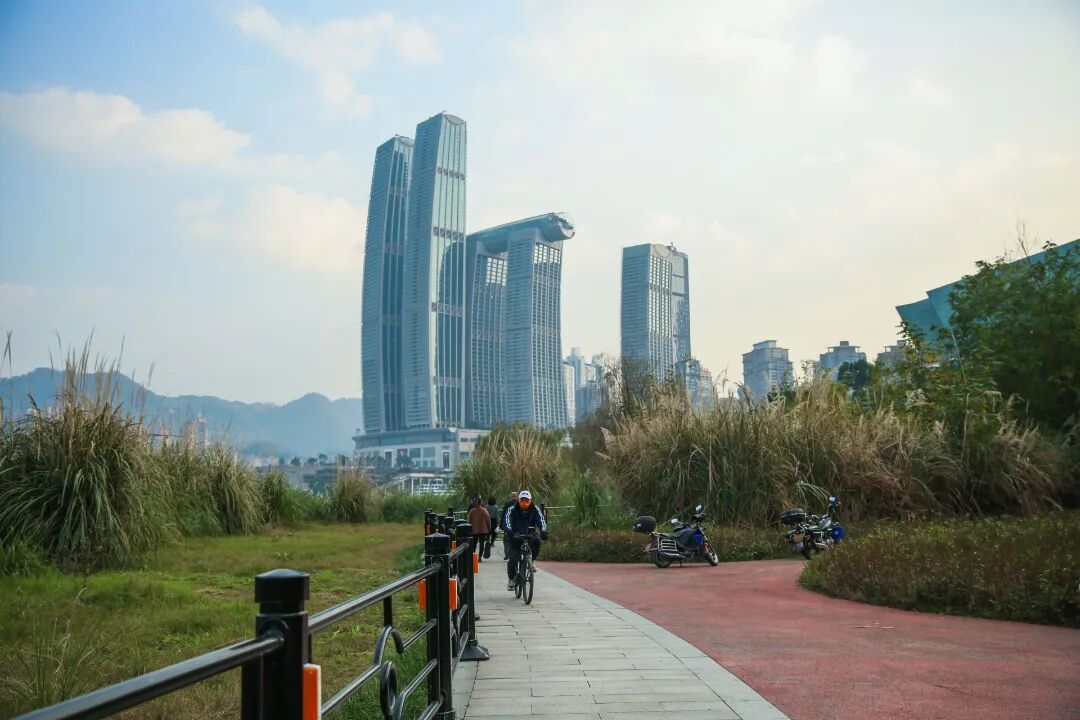 而平缓的滨江步道展开