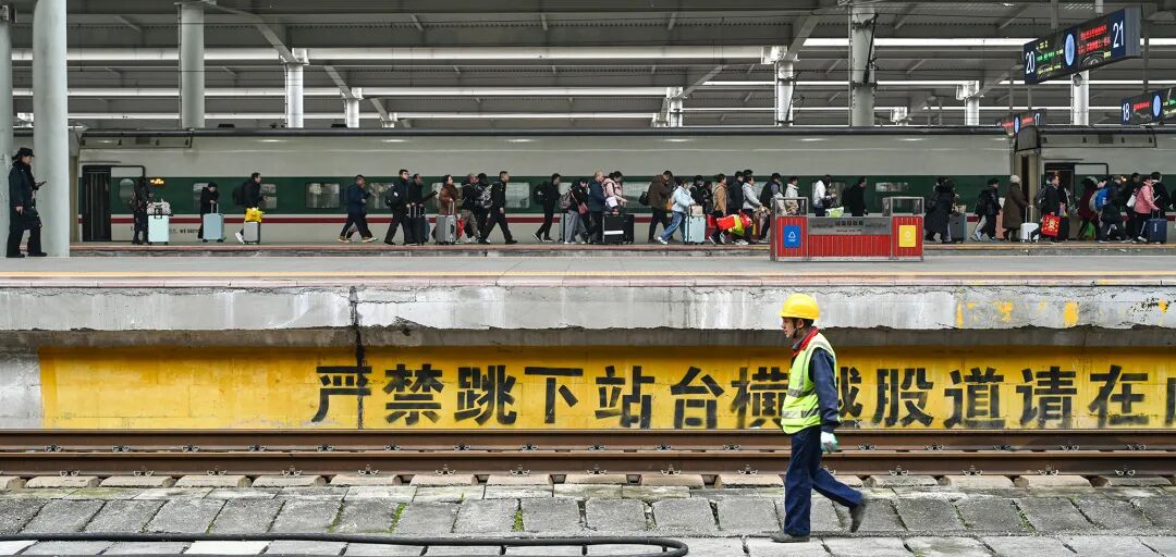 2月2日,重庆北站春运启幕,站台上归人步履匆匆赴团圆,站台下轨道检修人默默巡检守平安。汪彦彤 摄